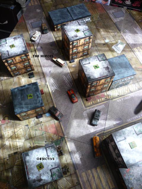 Il faut embarquer les enfants et fuir. Comme il n’est pas possible de sortir par où nous sommes arrivés il faut s’enfoncer dans la ville (dans le prochain scenario il y aura déjà des zombies sur la table : 1d6 par personne y compris les enfants cela va être drôle…). Tracy sort de la voiture et tire six fois (avec ses machine pistols) et ne touche qu’une fois ! Le zombie est juste KD. Lee tue le zombie devant lui. Josh sort du bâtiment et tire : un Z dead. Fred Costa garde les enfants à l’intérieur pour l’instant (il reste toujours des Z dans les 12’, ce qui affolerait les petits).
